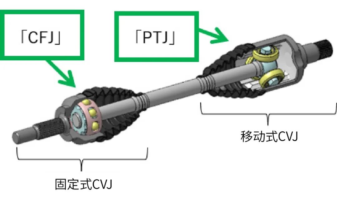 為了滿足這些需求,NTN推出了一款將高效率固定式等速萬向節(jié)“CFJ”與低振動(dòng)移動(dòng)式等速萬向節(jié)“PTJ”相結(jié)合,更適配于電動(dòng)汽車的優(yōu)秀驅(qū)動(dòng)軸。“CFJ”是一種具有低扭矩?fù)p失率(高傳動(dòng)效率)的CVJ,而“PTJ”則具有降低滑移阻力的特點(diǎn)(引發(fā)整車振動(dòng)問題的因素)。