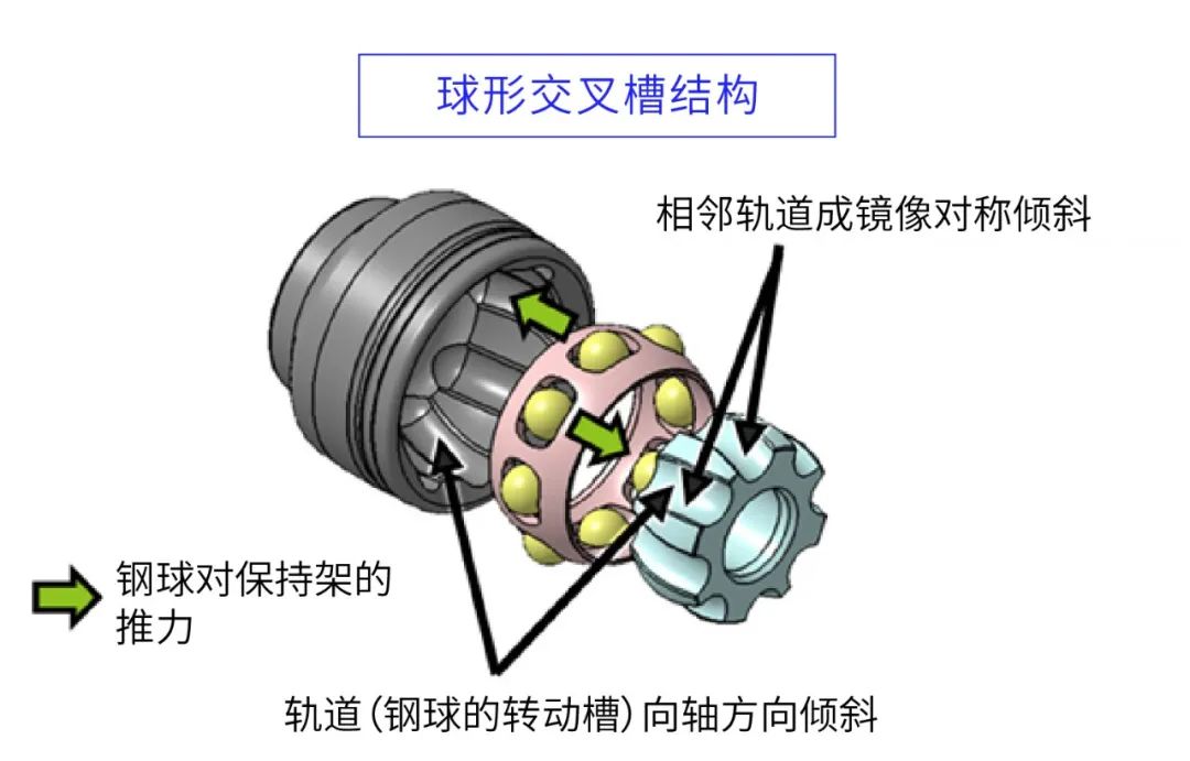 “CFJ”是一種固定式CVJ(等速萬向節(jié)),它極大地改變了NTN傳統(tǒng)萬向節(jié)的基本結(jié)構(gòu),并采用了NTN獨(dú)有的“球形交叉槽結(jié)構(gòu)*4”,該結(jié)構(gòu)可以抵消內(nèi)部組件所產(chǎn)生的力。